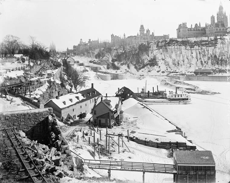 Rideau Canal entrance and locks from Kìwekì Point, March 1900. Credit: Topley Studio / Library and Archives Canada / PA-008981