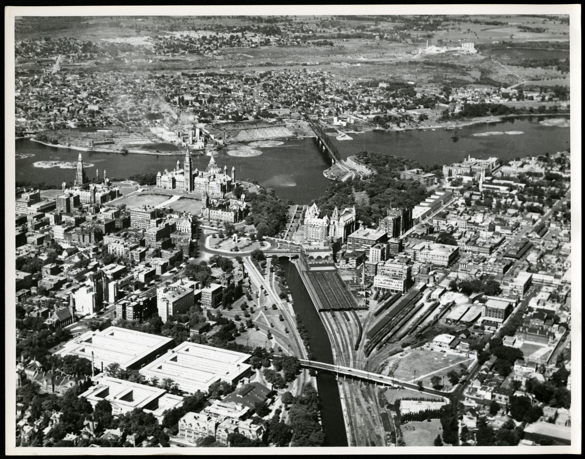 Aerial view of Ottawa, with tracks into Union Station, ca. 1952. Credit: Library and Archives Canada / e999909320