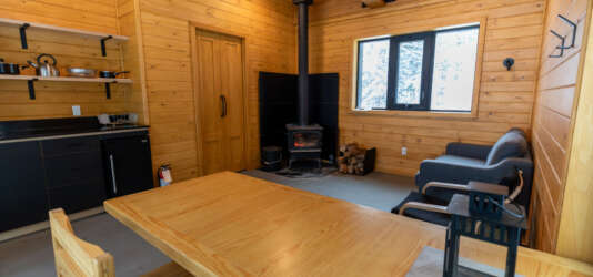 Amenities: Bunk beds with mattresses, tables and chairs, pots and pans, solar-powered lights, wood stoves, refrigerators or coolers, propane burners (indoors) or barbecue, fire pits with grill, picnic tables, dry toilets, and parking space for one vehicle (two at the Philippe cabin).